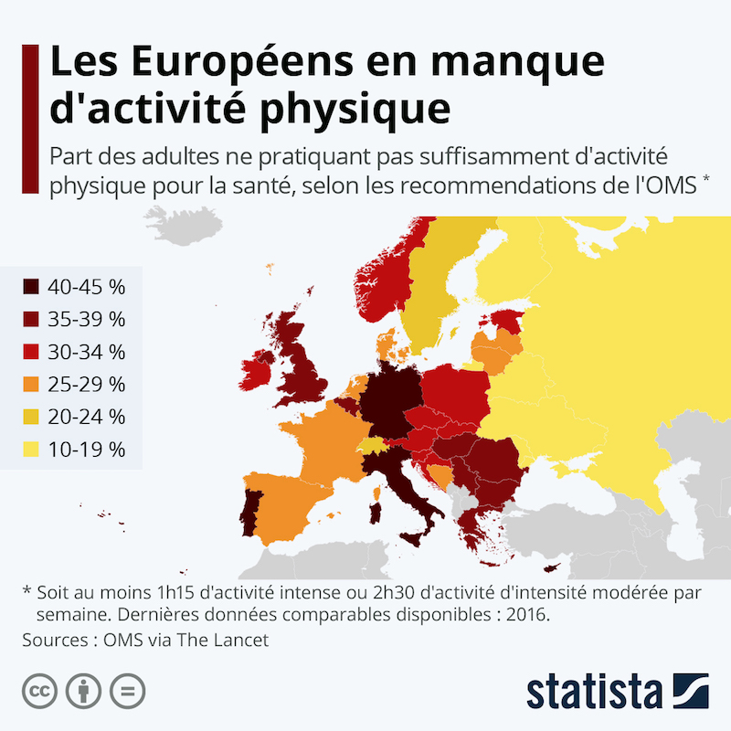 C’est peut-être là que le bât blesse dans le monde contemporain. L’institut allemand de statistiques Statista basé à Hambourg a révélé que les Européens n’auraient, en temps normal, pas suffisamment d’activité physique pour rester en bonne santé.